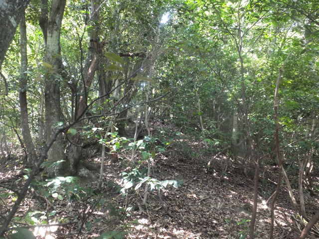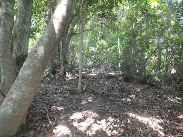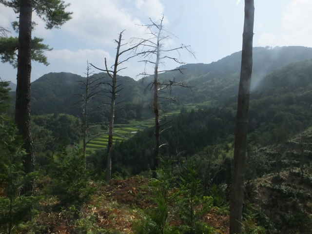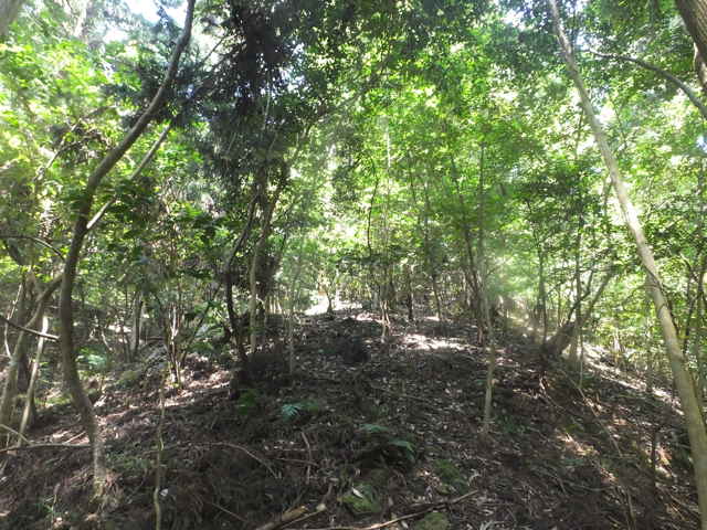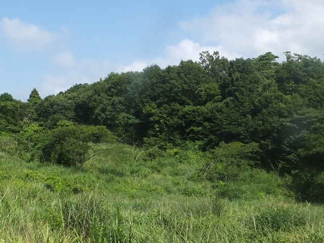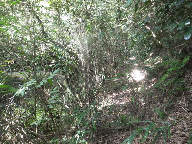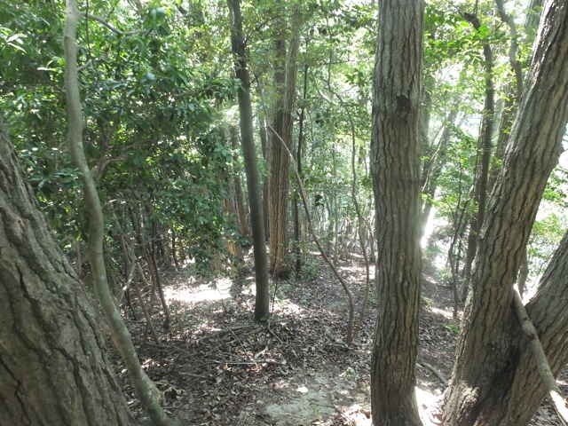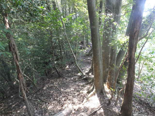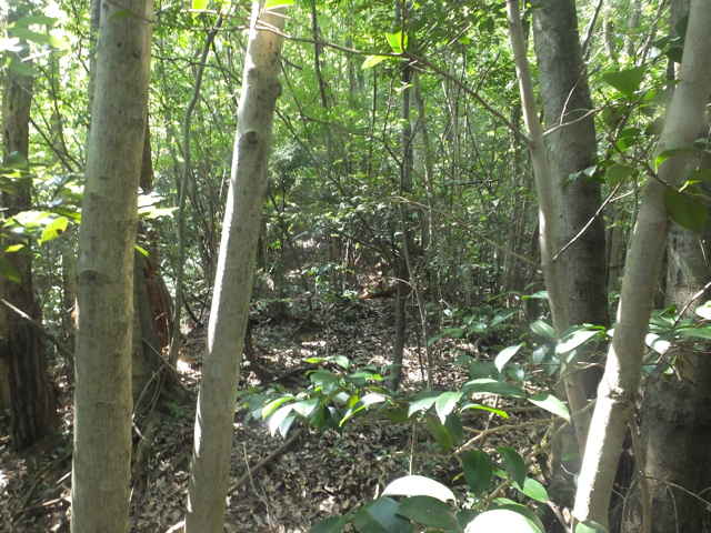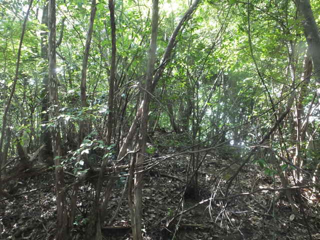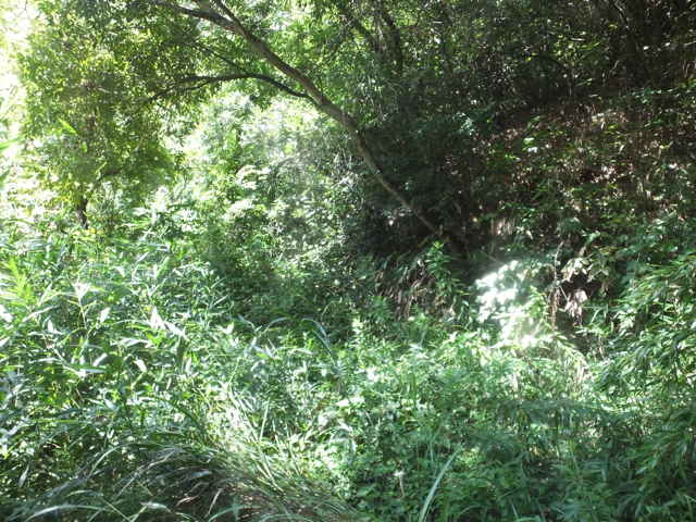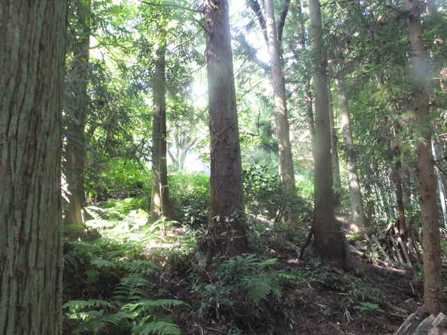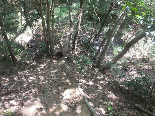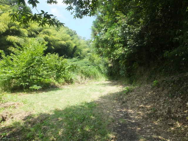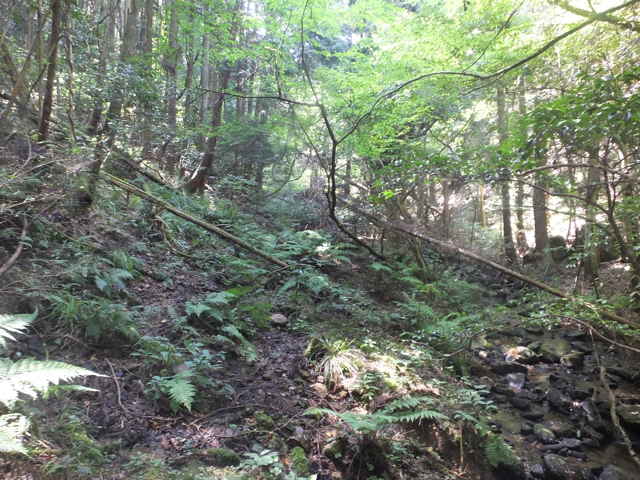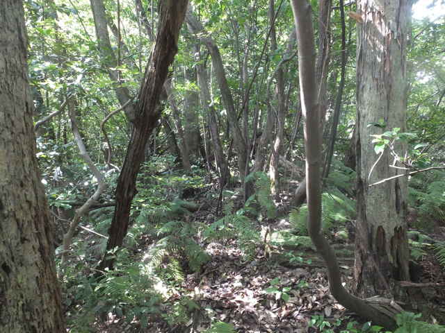 | 先日(8月18日)に歩いた稲葉の旧道の、谷から尾根に上がるルートが若干旧版地形図とは違うようなので、再度斜面に踏み跡はないか確認することにしました。 溜池脇から谷へ入ると左は急斜面で、踏み跡の痕跡は見当たりませんでした。上がれそうなところは、先日の尾根筋の斜面しかないようです。谷の奥へも入ってみましたが、やはり上がれそうな場所はありませんでした。 先日上がった斜面まで引き返し、尾根に向かって上がりました。上がる途中で、交差するような踏み跡はないかと注意をしていると、1箇所だけ左へ斜面を横切る獣道のようなものがありました。しかし、これもたどってみると途中で消えてしまい、違うようです。結局、谷から尾根に上がる旧道のルートは、確かめられませんでした。 尾根から下っていく踏み跡がありそうなので、下ってみました。しばらく尾根を下ると、前方が急斜面となっていました。右の尾根筋が伐採された植林地で、作業用の踏み跡があるので、伐採地の急斜面を下りました。急斜面を谷へ下りると常栄寺の西の谷にある作業道へ出てきました。 |
