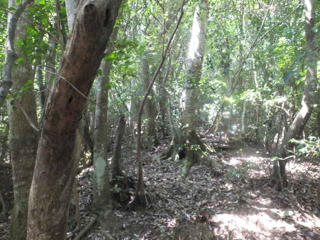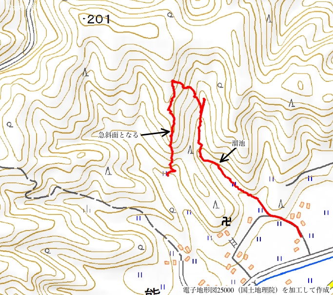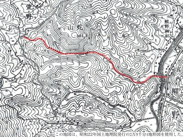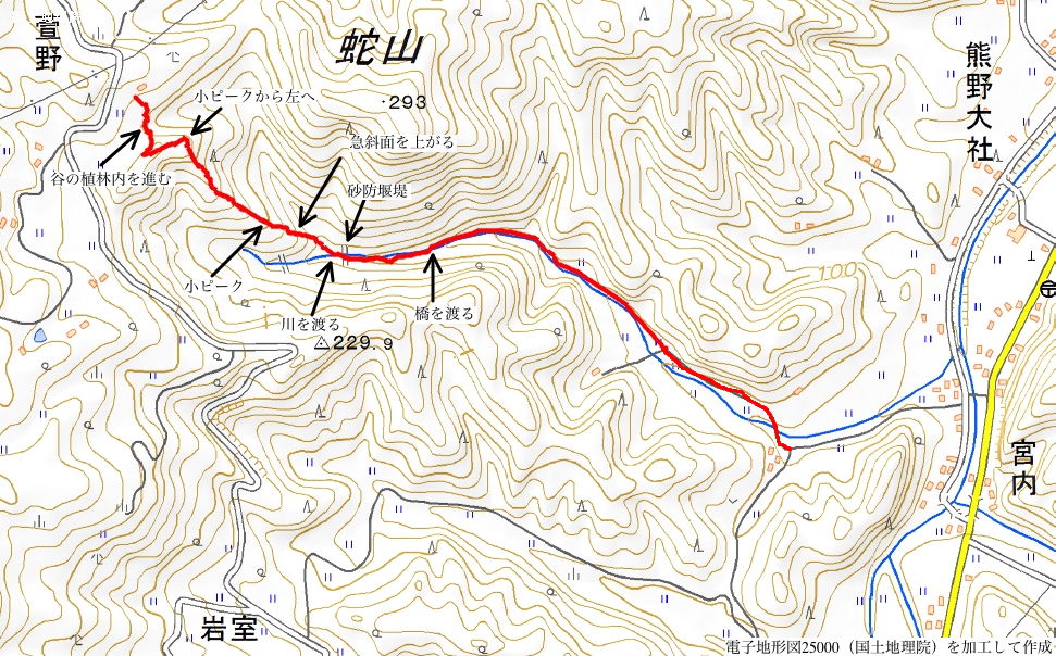 | 昭和22年発行の旧版地形図を見ると八雲町熊野の宮内から蛇山へ向かって谷を入って、萱野までの山越えをする径が描かれているので、確認しようと出かけました。 熊野大社から南へ進むと、上の宮跡の手前に橋があり、蛇山へ向かって谷を入っていく道があります。少し入って南へ分岐する道の角に民家があり、その前から歩いてみました。 さらに谷を上がって行くと、左の谷の奥に民家があり、その前の田んぼの脇から作業道が続いています。やがて作業道は川沿いに進み、山の中へ入って行きます。薄暗い林内のため、草なども少なく、歩くのにはあまり支障はありませんでした。 やがて橋を渡って進むと、左手の斜面を上がっていく径が見えます。これは、地理院地図の1960年代の空中写真に写っている径と思われます(帰り道で市道を下がるときに、三角点近くで、出口と思われる径がありました。)。橋を過ぎると、だんだん径は荒れた感じとなり、倒木が折り重なった場所もありました。倒木を越えていくと、砂防堰堤があり、広かった作業道はここで終わりのようです。 堰堤を越えると、小木が生え荒れていますが、川へ向かい、小さな流れの川を渡ります。ここで谷が左右に分かれ、川も分岐しています。右手の谷沿いに踏み跡があるようにも見えますが、谷に挟まれた正面の急斜面の尾根に向かいます。 急斜面には踏み跡は見えませんが、上に向かってまっすぐ20分ほど急斜面を上がると、緩やかな尾根径になりました。尾根径は、最近では歩く人もいないと思われ、小木が生え、枝が伸び、切り払わないと、通れないような場所もありました。久々の藪こぎの尾根歩きです。 このルートのピークへ上がった平坦な場所に、大きな溝があり、またゴミが散乱しており、以前はこの場所に生活の場があったのかもしれません。ここから旧道は水田脇を西へ向かったようですが、木々の先に見える谷の水田跡は原野となって藪の状態で、通れるようには見えませんでした。少し先へ進んでみても、状況は変わらず、溝の場所まで引き返し、ここから谷へ下ってみました。急斜面を下りると、一度平坦になり、さらに下りると谷につきました。 谷から原野の方へ進んでみましたが、やはり通れるような状態ではありませんでした。ここから北へ向かうと鉄塔巡視路に出会うはずなので、植林地の端を北へ進むと、やはり先日、松江知井宮線鉄塔No.23へ向かった巡視路に出会い、民家の前に出てきました。 ここからは、市道を通って岩室から県道大東東出雲線へ下りて出発地まで歩いて帰り ました。 |