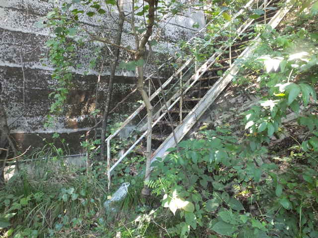 | 東持田町 11:28 急な階段を上がる。 | 11:32 堰堤の上部に上がる。 | 11:33 奥に進むが、小木が枝を伸ばしている。 |