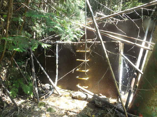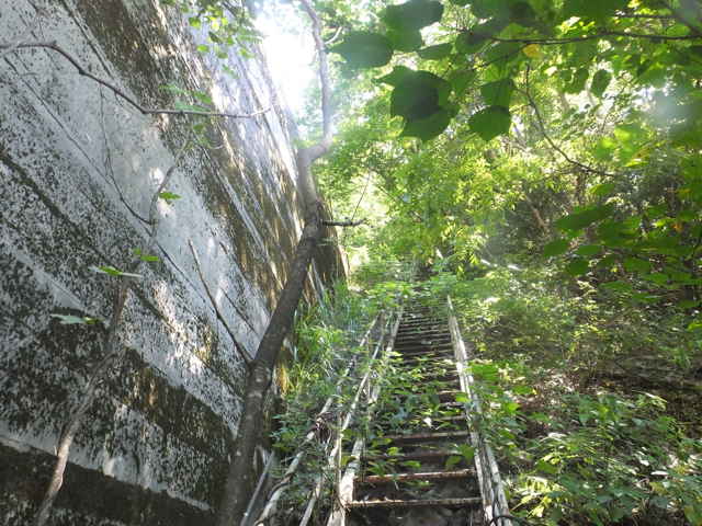 | 東持田町 11:45 谷の奥に大きな構造物が見える。 | 11:47 右端から谷へ入る。 | 11:50 堰堤の梯子を上がり、更にもう一段上がる。 |