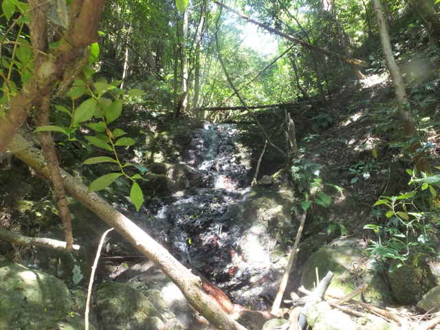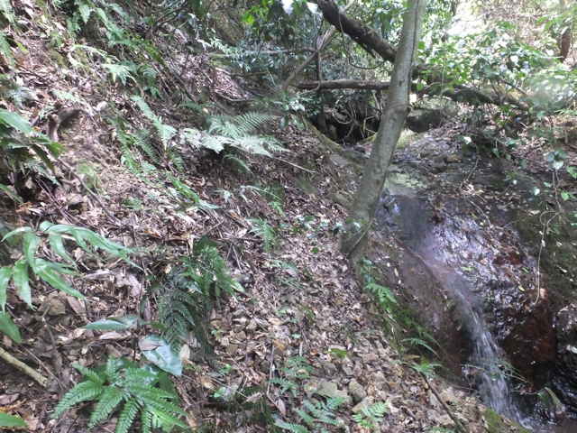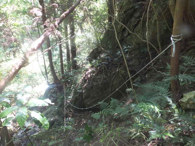 | 東持田町 岩場にロープを張った。 | 13:40 滝の左の斜面の木にテープがある。 | 13:46 超急斜面を上がる。 |