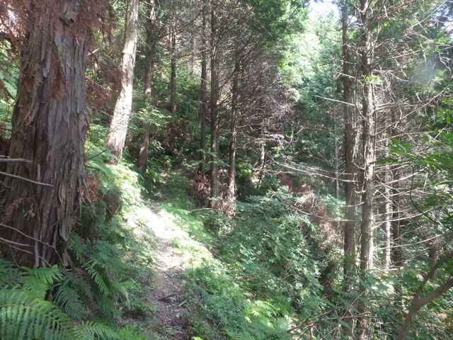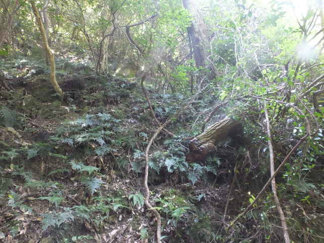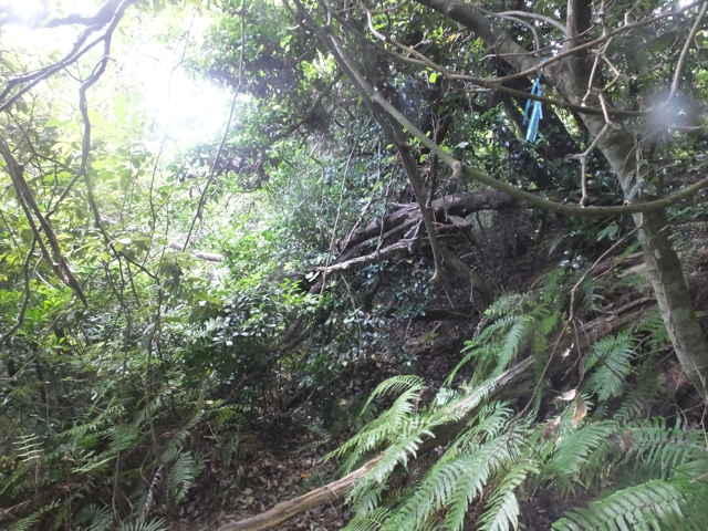 | 東持田町の金井谷の川を遡って行くと、高さ数十mの「大滝」があります。ただ、途中に何か所か急斜面を上がらなければならないので、今回急斜面にロープを張りました。これでいくらか楽に上がれるようになったと思います。 大滝の左の急斜面の木の幹にテープが巻いてありました。ここから斜面を上がれるということでしょうが、斜面は超急傾斜で、「上がれる」というより、「上がった、下がった」ということでしょう。 急斜面を木につかまりながら上がって行くと、ところどころにテープが巻いてあり、方向がわかりますが、木もまばらにしかなく、つかまる木を探しながら、地を這いながら上がっていきました。しかし、途中でまっすぐにも、左右にもテープが見えなくなり、動けなくなってしまいました。右手の方に、少し谷になったような場所があり向かってみると、またテープがありました。ここからまっすぐ斜面を上がると、鉄塔巡視路に合流しました。転げ落ちそうなこの急斜面のルートは、人に勧められるルートではありません。 巡視路へ上がってからは、滝の上部から谷を回って、尾根の巡視路を下がりました。巡視路の途中の十字路から右へ曲がると古い径があり、出発した草地に下りてきました。 今日は樹林内では、GPSが暴れており、3機種とも正確なログが取れていませんでした。特に休憩や作業で同じ場所にとどまっているときは、誤作動が多いようです。 |