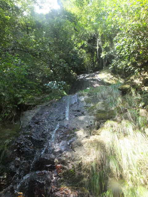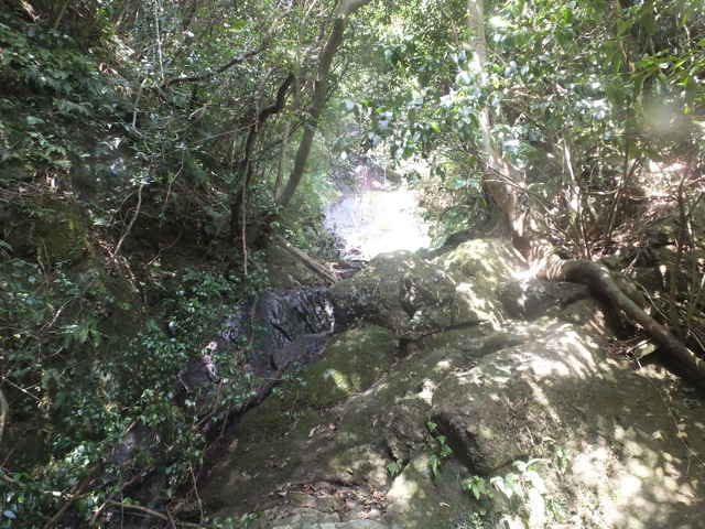 | 東持田町 13:09 | 13:12 谷の奥に大きな滝が見えてくる。 | 滝の手前の岩場を登る。 |