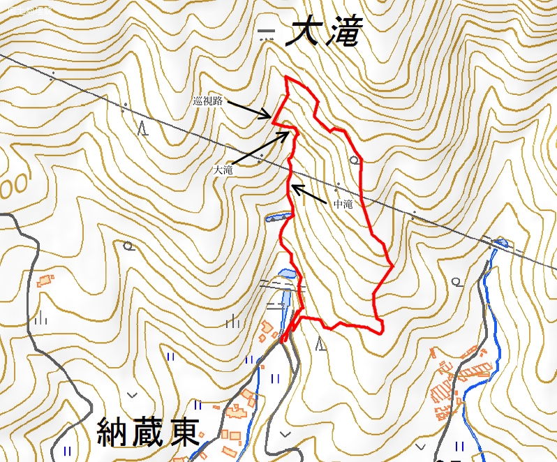 | 東持田町 14:04 滝の上部の谷を渡る。 | 14:08 巡視路を進む。 | 14:11 |