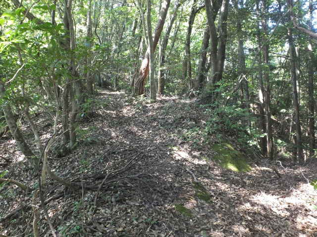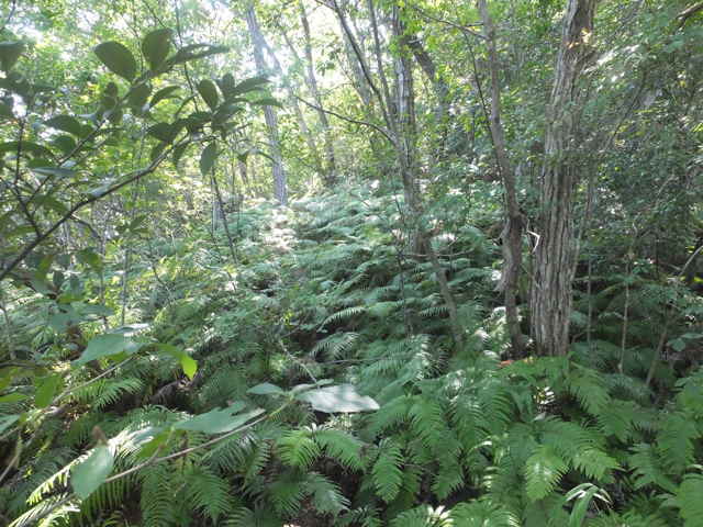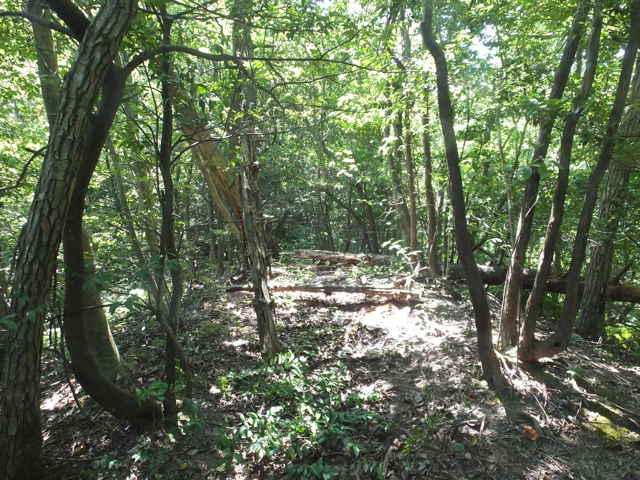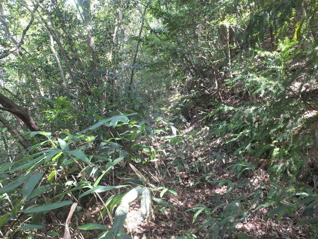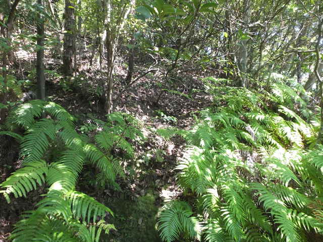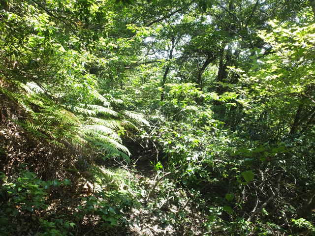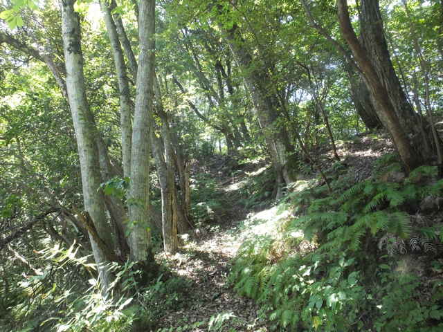 | 先日8月18日に稲葉からの旧道を探して歩いたときに、林道島村線からの旧道との接点が不明だったので、林道から上がって確かめることにしました。 森脇から市道を上がると、左へ林道島村線が分かれます。林道をさらに1kmほど上がると、道路のすぐ左側に川があります。川に下り、飛び石伝いに川を渡ると、平場があり、さらに右の方から斜面を左へ上がっていく踏み跡があります。地形図を見ると、旧道はもう少し上流から川を渡ったようですが、今は原野になっていて通れそうにありません。踏み跡は最初は笹が生えていますが、やがて笹はなくなり、広い径が斜面を上っています。5分ほど上がると、峠について、径は下って行きますが、右手の尾根にも踏み跡が続いています。 峠を越えて斜面を下っていくと、大きな倒木があり、右の下り斜面へ回って通りました。やがてシダが多くなって径が見えなくなってしまいますが、シダの中を進むと、右下へ径が続いていました。シダを越えてしばらく行くと、前方にはまたシダが密生してきます。以前にこの径を通ったときにも、シダの中をむりやり下がった覚えがありますが、今ではこのシダの中を通る元気はありません。 このあたりが8月18日に歩いたときに、この径と最接近した場所になるので、左の斜面を探すと、踏み跡らしきものが斜面を上っていました。斜面を上がると、数mで山を下りてくる径と出会いました。やはり今日の径とは直接接してはおらず、先日は分からずに、通り過ぎていました。この径に峠の尾根から下りてくる踏み跡はないかと、探してみましたが、見えませんでした。 峠まで引き返し、西に向かって伸びている尾根の径を上がってみることにしました。尾根の道は、はっきりしていて、小ピークへ上がって、さらに次の小ピークへ向かいます。ここから少し径が荒れた感じで、シダが多くなる場所がありますが、概ねはっきりした踏み跡が続いています。次のピークへ上がると、倒壊したアンテナ施設のようなものがありました。ここから先の尾根には踏み跡がないので、この尾根の径は、アンテナ施設の管理道だったのかもしれません。 |