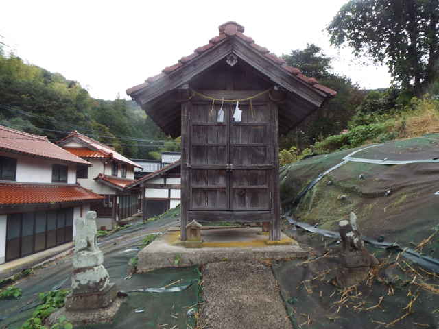 雨が小降りになったので、西谷町の谷の奥の宇山にあるという「宇山稲荷」を探しに向かいました。道路法面の上に宮庫のようなものが見え、歳徳神かと思いましたが、狛犬に並んで、狐像があるので、これが稲荷神社だと思いました。近所で尋ねると、やはり稲荷神社で間違いありませんでした。