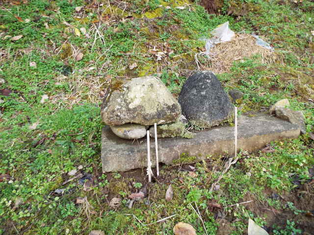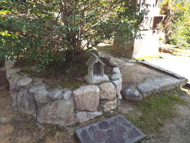 今日は、秋鹿地区の神社跡を探すことにしました。 秋鹿地区へ行く前に、大野で山築明神社跡の全景の写真や、牛頭天王社の猫神さんを写しました。牛頭天王社へ行く手前で、道路脇のこんもりとした森の中に石灯籠が見えたので寄ってみました。近くの人に尋ねると、「『大将軍塚』で、地元では、「だいじゃご」と言っている。」とのことでした。 秋鹿公民館の進入路の脇にお堂があって、覗いてみるとお地蔵様が祀られていました。 「あいかの里」の付近にあった新宮神社の跡地を、近所で尋ねると、「家の脇から尾根を上がると、小さな溜池があり、子供の頃、その脇に小さな祠があった。新宮神社の跡だったかどうかはわからない。」とのことでした。 多太神社を過ぎたところから、西の道路を山の上まで上がり、谷の下に家が見える辺りで、道路の上を見ると、壊れた石祠の屋根のような石が祀られていました。谷の下の家で尋ねると、これが本宮神社の跡だとわかりました。 山の上の道路を下って行き、字頃垣と思われる場所で、瀧神社の跡を尋ねました。「場所はこの辺だったが、新しい道路ができて、変わってしまった。」とのことでした。 |