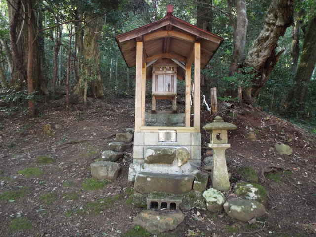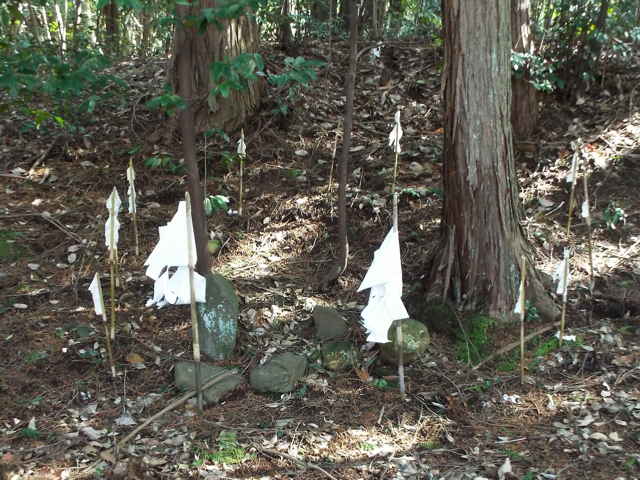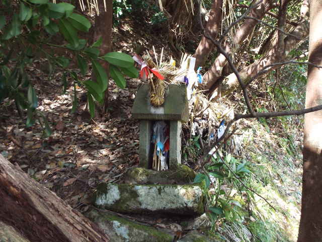 | 東岩坂から西岩坂へ越える峠になるところに、「禅定寺城跡 登山口」と書かれた標識があり、入ってみると注連縄が張られ、高さ50cm位の立石を取り囲むように石を並べて、その周りに御幣が立てられていました。普通の荒神のように藁蛇がありませんでした。 城跡は頂上のようですが、径がはっきりしないので、今日のところは止めておきました。 熊野の大石で先日「雲場神社跡」を探しても見つからなかったので、再度場所を広げて探してみました。少し南へ離れた林の中へ続く径があり、その中に標柱がありました。周りの田んぼより一段小高くなった森の中でした。 この神社跡の標柱は最初は風土記所載神社の跡地を表したものと思いましたが、この「雲場神社」や、以前に見かけた「大田山神社」など風土記には載らない神社の跡地もあるので、これは「八雲村誌」にある、明治41年に村内の神社が熊野大社の伊弉那美神社に合祀された時のものではないかと思われます。合祀された神社は、事解男神社、速玉男神社、八所社、五所社、久米社(以上は上之宮)、前神社(稲葉)、能利刀神社(大石)、田中神社(大石)、楯井神社(大田)、布吾彌神社(大石)、矢谷山神社(矢谷)、藤代神社(森脇)、大田山神社(大田)、雲場社(大石)、素盞嗚社(宮内)、金田社(岩室)、天野八幡宮(須谷)、萱野山神社(茅野)、恵美須神社(市場)、養蚕社(境内)があげられているので、今後確かめたいと思います。 標柱は、「昭和61年 に天皇陛下御在位60周年事業の一環として熊野大社により建てられたもの。」(八雲村文化財調査報告書 大田山神社跡)とあります。 西岩坂元田でちょうど庭に出ておられた方に、築貫神社について尋ねると、「その畑の先の径を山へ上がるとある。」と教えていただき、すぐ小さな神社へたどり着くことができました。近くには扁額に「元田瑠璃光薬師如来堂」と書かれた、薬師堂がありました。 最後に青木で産魂神社について散歩中の方に尋ねますが、「わからない。昔はあの山に神社があったが、今は磐坂神社にある。神社跡には今でも石垣が残っている。」ということでした。もう一人の方も、「あの山に神社はあったが、今は他にはない。」とのことで、山の際へ行ってみると、竹やぶの中に神社の跡らしい、石垣や石段、また自然石の立石などがありました。荒れ方をみると、相当古い時期に廃止されたという気がします。 |