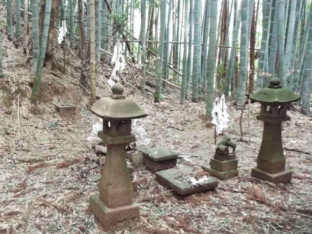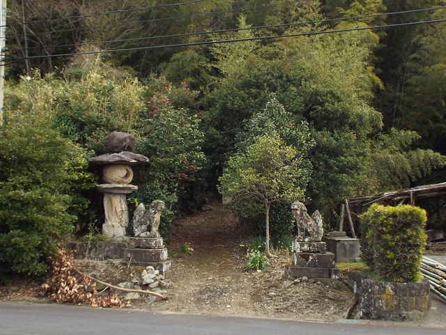 | 朝酌町から上宇部尾町に抜ける道路の、朝酌小学校近くに上組バス停があり、その近くに大きな石灯籠があります。ここが朝酌上神社の跡地で、今は多賀神社に合祀されていますが、ここにも小祠が祀られています。 多賀神社、矢田の渡しを過ぎて行くと、山際の斜面に小祠があります。これは、以前に朝酌町の禅定寺付近への山越えの道を探している時に見つけたものですが、現在付近が工事中で、お願いをして入らせていただきました。以前は竹やぶに入った場所でしたが、竹やぶの斜面は削られ、外から見える状態になりました。 福富町へ入る手前の山の斜面に細い石段の径が上がっていました。竹やぶの中を少し進むと。注連縄が張ってあり、その先に石灯籠と狛犬が置かれ、荒神らしきものが祀られていました。狛犬が置かれた荒神は今まで見たことがなく、なんとなく昔は神社があったのではないかと思われるような作りです。近所の方に話を聞くと、「私は長らく土地を離れていたので、神社があったのかどうかはわからない。荒神さんと呼んでいる。」とのことでした。 福富町の集落の間を奥まで入ると、福富神社の跡があります。今は多賀神社に合祀されているようです。神社の裏山からは「福富の清水」が湧き出ていて、湧口には御幣が立てられていました。神社の左奥の斜面には荒神が祀られていました。 大井神社から県道を挟んだ東側の山に金刀比羅神社がありますが、道がわからず、最初は県道から山へ入って急斜面を上がって行くと、神社の裏へ出てきました。本当の道は山の西側の集落の北のはずれから上がっていました。 |
