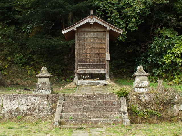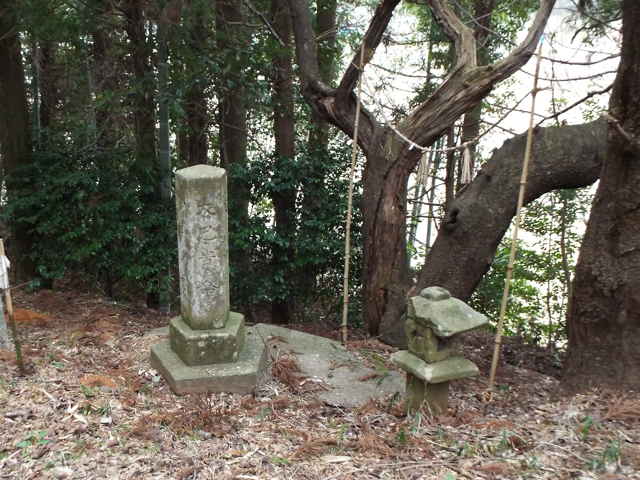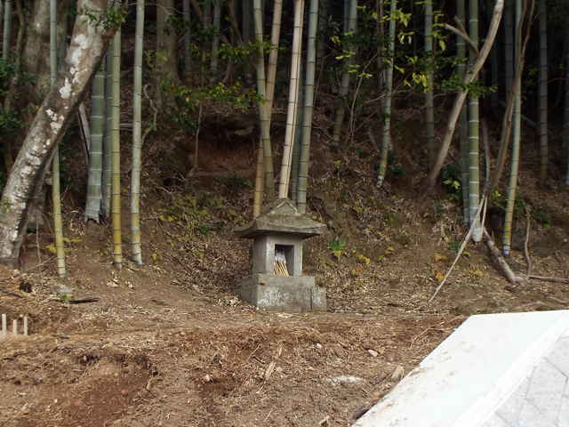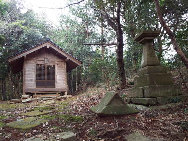 | 十二所神社から東へ向かって行き、県道の大海崎東トンネルの出口付近の道路法面に階段が上がっています。ここから15分ほど上がった山の頂上に金刀比羅神社があります。ここは以前に三角点を探して登った時に、見ていました。神社名を書いたものはありませんが、屋根に丸の中に金を書いた神紋があったので、金刀比羅神社で間違いないと思います。 山へ続く道があると、その先に何があるのか気になって入ってみます。お墓があることが多いですが、帰りがけに大井町の道路法面を上がっていた径の先には、社日碑が祀られていました。 |