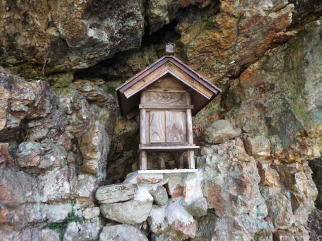 | 今日は、先日訪れた八雲町平原の宇留布神社の旧社地が藪になっているので、木を切ってもいいか、神社へお尋ねしました。関係者と相談して連絡するとのことでした。ついでに平原で探している、猪子堀の荒神社や賽荒神社のことを教えていただきました。 平原の旧道を上っていると、道路右側の林の斜面に石垣が続いており、中にはいってみると、道路に沿って平坦な場所が続いていました。その端には小さな石祠がありました。民家の跡でしょうか。 途中の家で、石垣のことを尋ねましたが、わかりませんでした。八雲村誌にある御崎社については、「郵便局の先の川の中にある。」とのことでした。郵便局の先から、川を注意深く探すと、少し先のところで、対岸の岩壁に小さな社が見えました。よほで注意をしていないと、見落としてしまいます。対岸には道がないようなので、川岸を下りて、川の飛び石を伝って渡りました。 八雲町熊野では明治41年に集落毎にあった神社が熊野大社に合祀されています。その旧社地には、昭和61年に熊野大社によって標柱が立てられているというので、まだ未確認の8社のうち、7社の跡地を探してみました。位置については、大まかな地図を熊野大社からいただきました。5社はすぐにわかりましたが、熊野大社近くの王子養蚕社と素盞鳴社は見つけることができませんでした。萱野山神社と合せて3社は、またの機会に探してみます。 帰りに乃木福富町で民家裏の斜面の上に社かお堂らしいものが見えました。上ってみると、中には仏像が祀られており、常松観音と思われます。 松江の神社 |
