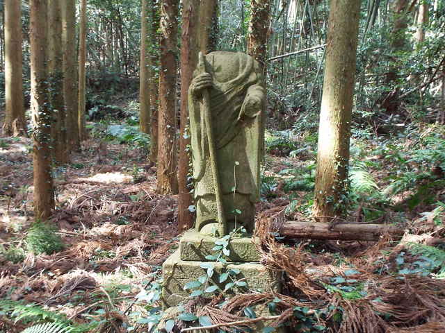 宍道町史にある、小さな神社や神社跡を探してみることにしました。 宍道に入る前に玉湯町柳井の弁慶岩を訪ねました。大きな岩の上に2つの石柱が立っており、一つには「龍王神」と刻まれ、もう一つは「天照大御神」などが刻まれた社日碑でした。また後ろ側には小さな石祠もありました。岩の下には鳥居があり、龍王や社日が祀られているようです。 宍道の八幡原にあるという「八幡宮」は以前にも探しましたがわからず、再度尋ねました。「八幡宮」という名前ではわかりませんでしたが、町史に書かれている「宍道二区の人が祀っている。」ということから、畑の中の大きなサカキの木のたもとの祠へ案内していただきました。近くに「八幡屋」という屋号の家もあるということで、ここで間違いないようです。 佐々布中で、金屋子神社を尋ねると、あの矢谷の奥の祠だろうと、谷の奥の現地まで案内していただきました。谷の道は鉄塔巡視路へ続き、森林公園へ行けるということでした。 佐々布下で「八幡宮跡」を尋ねると、少し離れた場所まで案内していただきました。その場所は、2021年9月5日に神社跡と教えてもらった場所でした。町史には狛犬が残っているとのことでしたが、痕跡もなく違う神社跡と思っていました。今回も狛犬のような痕跡は見当たりませんでしたが、尋ねた方が町史に関係していたそうで、ここで間違いないようです。 『八幡宮跡」を見た後で、地区の荒神へ案内していただきました。加茂社の近くにあり、以前は山で藁蛇を作ってお祭りしていたが、それもできなくなり、社日碑のある場所へ移し、小さな石祠を作ったとのことでした。社日碑の隣には、御崎大神と刻まれた石碑も立っていました。 佐々布の岡の目で広域農道から別れて細い道を西へ向かって上がります。最奥の家で普門寺の天津神社跡について尋ねると、「お寺があったという話は聞いているが、神社のことはわからない。お寺の跡には、お地蔵様がある。」と場所を教えてもらいました。谷を奥まで上がって行くと、山の斜面に、「みさき神」という看板が立っていました。斜面を上ってみると、細い藁蛇がかけられた荒神が祀られていました。ここから少し上がると、作業中の方がおられて尋ねると、「ここら辺が普門寺で、そこにお地蔵様がある。今は頭が壊れてなくなっている。」とのことでした。この寺跡に神社もあったものと思われます。 JR木次線の南宍道駅からさらに金山上の集落を過ぎると、左に川にかかる橋があります。橋を渡って、山の斜面に向かい、つづら折れの急斜面の道を登り、尾根道からピークへ上がると、小さな石祠が立っています。石祠の中には、「大ごんげん」と書かれた石版がありました。 |