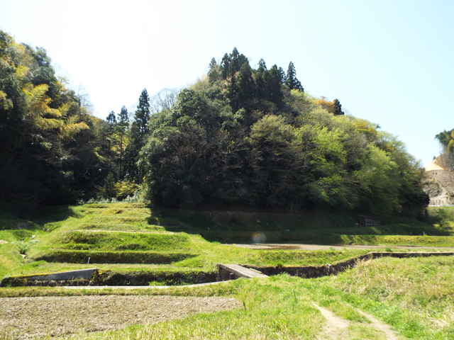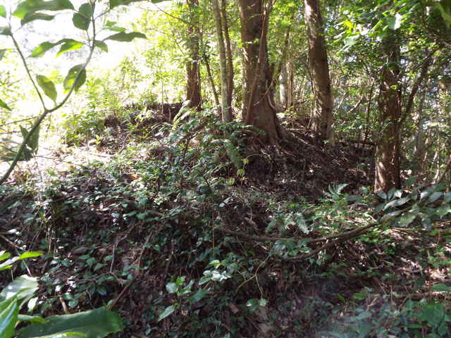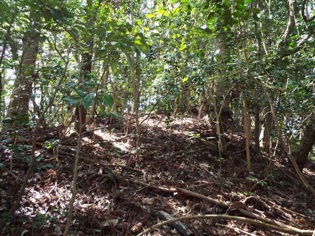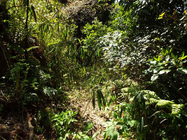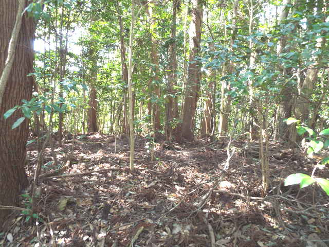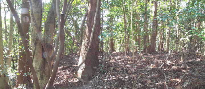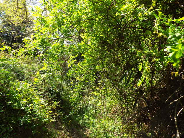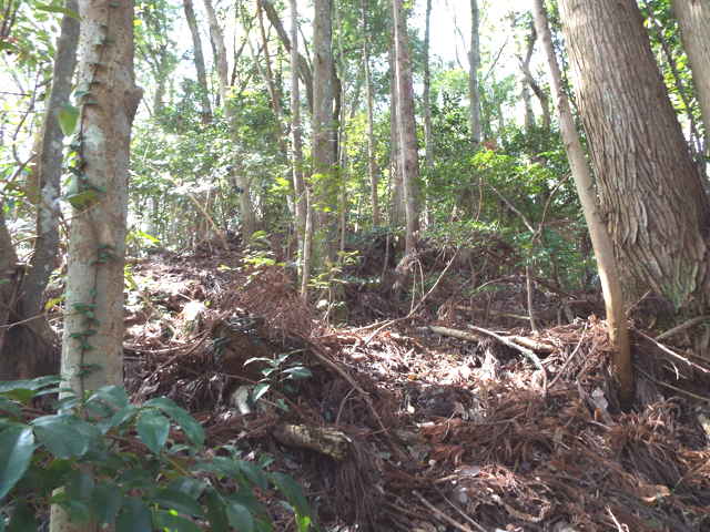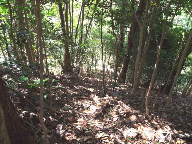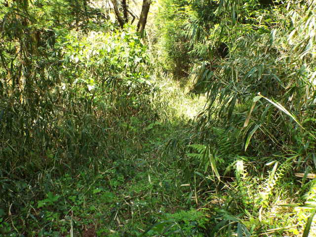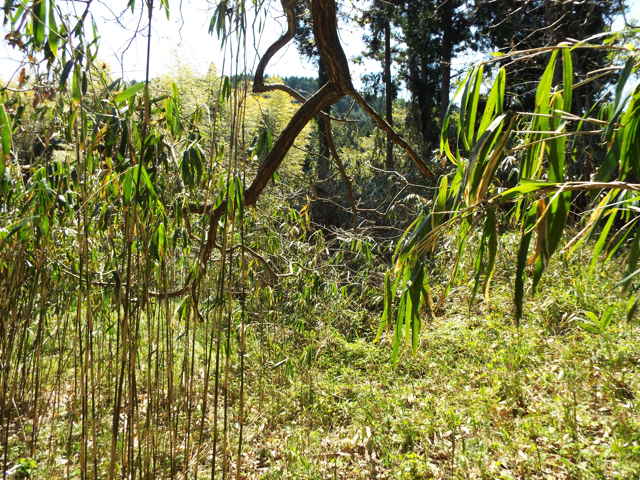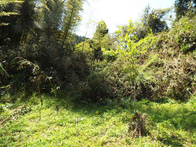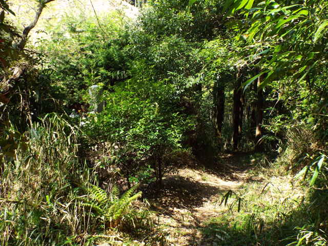 2021年9月25日に玉湯町中大谷の堰堤の橋を渡ったところの山の上にあったという小丸山神社の跡地を訪ねようとしましたが、畑の跡地が藪となっていて入れなかったので、今回反対側の北側から山へ登ろうと思いました。 山の反対側には急斜面にはっきりした踏み跡があり、下がってみると、開けた場所があり、笹が刈られた形跡がありました。左へ入ってみると、畑の跡があり、最近管理されているのか草があまり伸びていませんでした。小さな梨の木の向こうにある道は笹が多いですが、昨年入りかけて断念した、堰堤からの道に続く、見覚えのある風景でした。茨のトンネルを切り開いて行くと、やはり堰堤の橋を渡り墓地の脇から上ってくる道に出会いました。 |