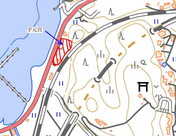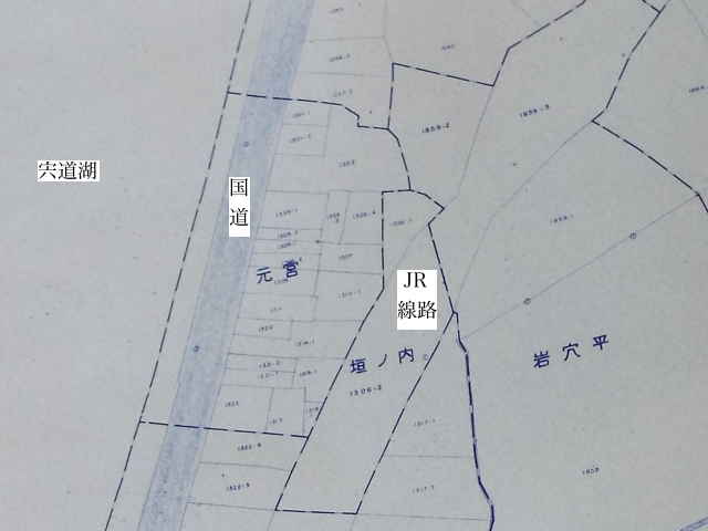 布宇神社が現社地に遷る前の元の場所が字「元宮」として残っているというので、資料館で字界図を調べていただくと、鳥ヶ崎の南西の国道と線路の間に字「元宮」がありました。1699年に火災により消失し、その後現社地に再建されています。当時の宍道湖は山際まで迫っていたと思われるので、現在の畑地ではなく、線路近くの少し高い場所にあったと思われます。 |