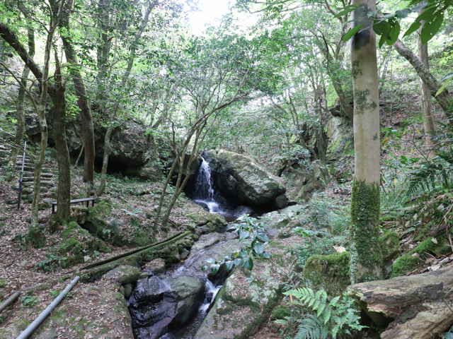 八雲村史の近世の神社の項に、「宝暦十四年(1764)当時の熊野の神社 五合瀧神社 (若松谷) 比婆山麓に有りかもちの瀧ともかつらの瀧とも云 川上に五合瀧在故熊野川之流を五合川と申 瀧坪之右岩窟に御座候得共大破仕唯今は社跡斗御座候 立彦霊神(髪髧瀧五合大明神『天文方御用手鑑』)」とあるので、天狗山登山道入り口にある「髢が滝」を訪れました。 |