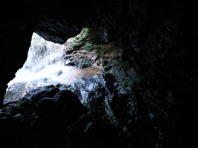 | この岩穴にあったのではないか。 | 滝の右側の岩の間に通路がある。 | 滝の裏側に入る。 |