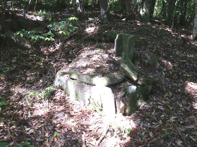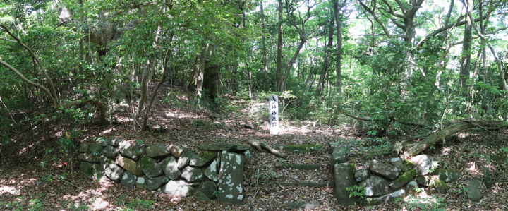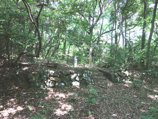 | 石垣が残っている。 | 標柱が立っている。 | 奥に壊れた石祠のようなものがある。 |