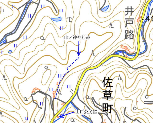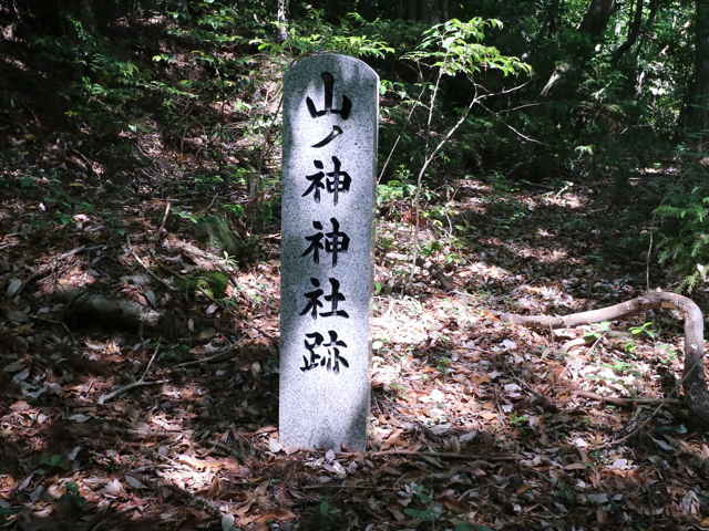 八重垣神社のHPに境内社の項があり、山神神社の旧社地について、「以前は佐草の里西側の山中、金起の旧街道沿いに祀られてあったものを明治頃に八重垣神社の境内に遷された御社です。」とあるので、八重垣神社でおおまかな場所を教えてもらいました。金起という地名は、古い地形図を見ると、八重垣神社から県道を南へ上がり、井戸路を過ぎて、山口公民館があるあたりを言うようです。 八重垣神社で「山口公民館の手前から山へ入った尾根の旧街道沿いにあり、今でも石垣が残っている。」とのことだったので、山口公民館の手前で尋ねると、家の前から山越えの道があるとのことでした。家の前から北へと道を進み左へ折れると、すぐ尾根に上がります。尾根の道は旧街道らしく、脇に石地蔵や敷石が残っています。尾根を右へ行き、しばらくすると、左手に石垣があり、その上の平場に「山ノ神神社跡」と標柱が立っていました。標柱は平成24年に立てられたものでした。 神社跡からも北へ向かって道は続いており、八重垣神社や西側の集落林原に向かっているようで、いつかこの旧街道を歩いてみたいと思います。 |