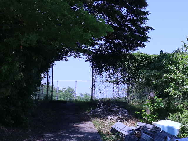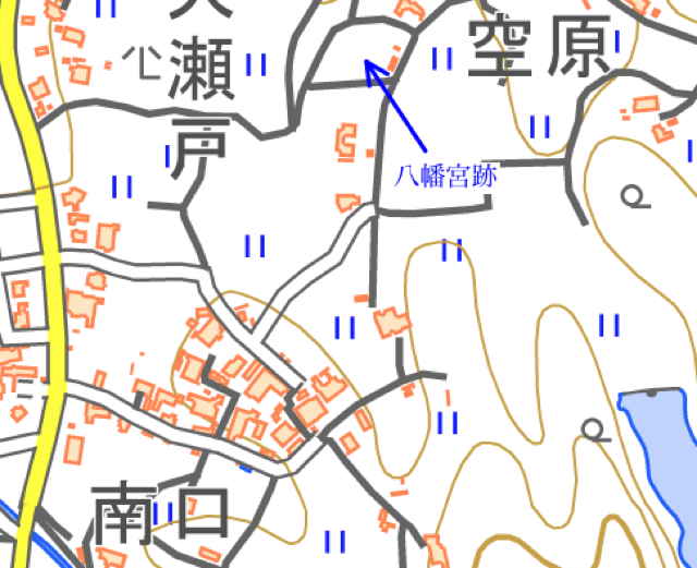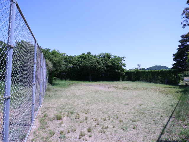 八重垣神社のHPに境内社の項があり、脚摩乳神社の説明に、「合わせて佐草字客山に鎮座していた八幡宮の譽田別命をお祀りしています。」とあるので、八幡宮の旧社地について八重垣神社で尋ねると、南口集落の外れに子供が遊ぶ公園のようなものがあり、そこにあったようです。」と、おおまかな場所を教えていただきました。 南口集落の北東の外れにフェンスに囲まれた小さな広場があり、近くの人に尋ねると、「ここは地名が客山といい、昔神社があった。」とのことでした。 |