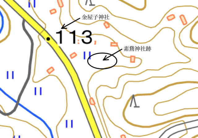 素鵞神社は明治43年に忌部神社(元大宮神社)に合祀されていますが、元は東忌部町字天王にあったとされています。天王という字名がどこにあったか不明ですが、宮内の鏡大明神(金屋子神社)の境内にある金刀比羅社は元素鵞神社の境内にあったとされているので、この金屋子神社の近くに字天王があると思われました。 忌部神社で尋ねると、「金屋子神社から70mほど南の家の脇から細い道があり、その奥にあったようだ。」とのことでした。 「元素鵞神社 大字東忌部字天王に鎮座せり。祭神素盞嗚命を祀りしなり。御鎮座年代不詳なりと雖も古老の口碑に往古より祭祀ありて即ち天正年間以前の創立なりと云う。」 |