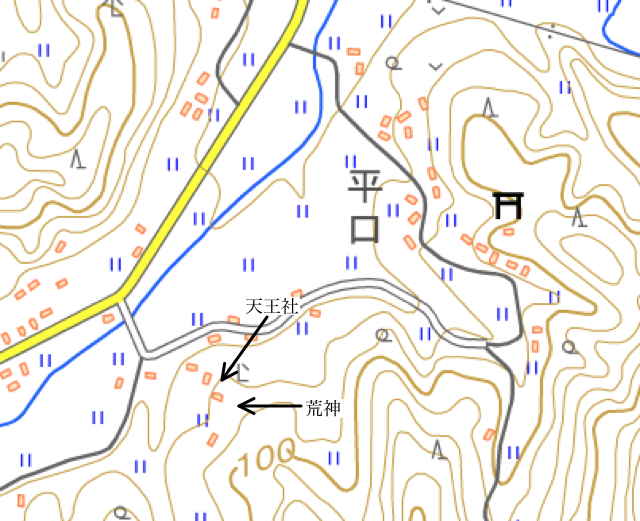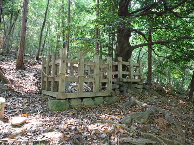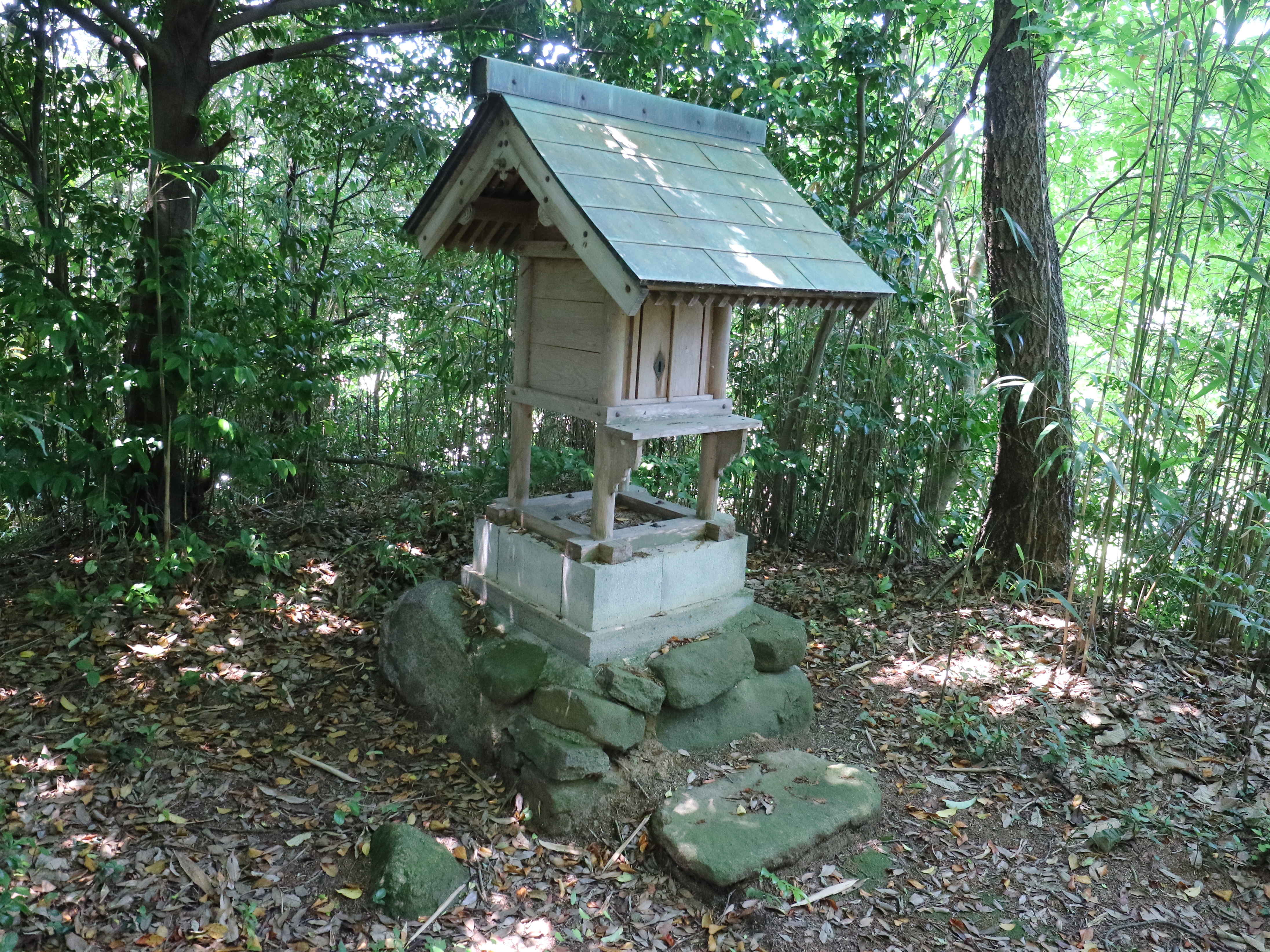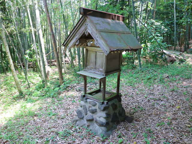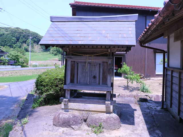 東忌部町平口の個人宅の裏山にあり、個人で祀られています。 仝上(※平口部落)大崎にあり。社殿二尺四方大鳥造祭神素盞嗚命にして舟木庫造之を祀る。悪疫流行の際霊験ありと傳う。祭日十月十一日」(忌部村誌) 社から南へ山の斜面を上ったところに神木という大きな樹が祀られています。これは、八雲村誌にある、大崎荒神と思われます。 「大崎荒神 平口部落舟木庫造宅東上山林中にあり仝人之を祀る。祭日十二月廿五日」(八雲村誌) |