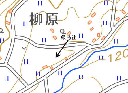 柳原地区の田んぼの中に小さな丘があり、こんもりとした杜になっています。山際を回るように道があり、山の斜面の参道を上がると、左に荒神が祀られています。頂上に上がると小さな祠が祀られています。 近所の方の話では、「子供の頃には『弁天さん』と呼んで、よく上がって遊んでいた。それ以来、もう何十年も上っていない。」とのことでした。 「厳島社 合殿比婆山粂神社 柳原部落にあり、祭神伊弉冊命、市杵島姫命、松浦萬之助之を祀る。祭日四月十六日 仝社賽路側に仝人持荒神及柳原下組荒神あり。」(忌部村誌) |