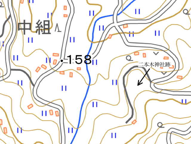 西忌部町大向の正覚寺前から上った家の石垣脇から細い道があります。道が大きくカーブする手前の左斜面に大向総荒神があり、その傍らに大きな松の木の切り株があります。忌部神社での話では、「随分前に大きな松の木は枯れてしまい、切り倒された。」とのことでした。 「二本木神社 右荒神(※大向総荒神)側にあり、昔七次神社御黨祭の時大雪の為参拝するを得ず止むなく仝地に止りて松の木を頼りに遥拝し祭事を終へたりしが現今同御黨祭(二月十八日には講員一同集りて祭事を行う。該松樹は現今逆枝を張りて実に数百年の樹齢を備え以て其昔を偲ばしむ。」(忌部村誌) |